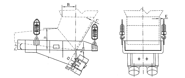 本系列電機(jī)振動給料機(jī)設(shè)計時未考慮倉壓的影響,為保證給料機(jī)的正常運(yùn)行,必須盡量減少倉壓對給料機(jī)的影響。因此在設(shè)計溜嘴時,應(yīng)用溜嘴的后側(cè)板承擔(dān)料柱的垂直壓力。溜嘴形式及配置可參考圖及表中數(shù)值。